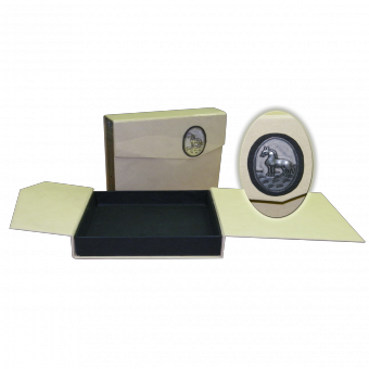 Handmade paper box with closing flap featuring an embossed real metal horse design.